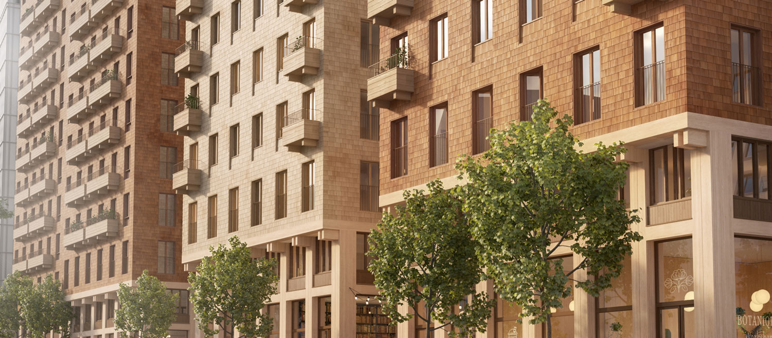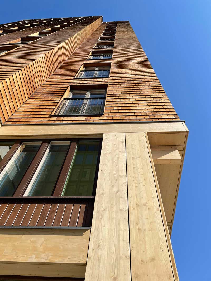 I en omgivning präglad av betong, järn, avgas och asfalt känns allt i trä som en lättnad. Hårda artificiella ytor får ge plats åt byggnader nästan tagna direkt från skogen. Varje hus blir nästan som en enda stor möbel. Roligt att kunna än mer förstärka träkänslan med Gran-X. Personligen tycker vi att Sockelvåningens träinklädda pelare och bjälkar blir som pricken över i.